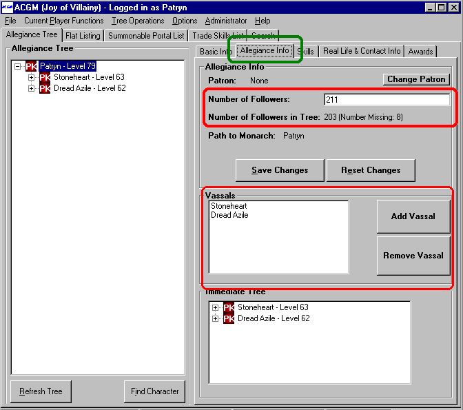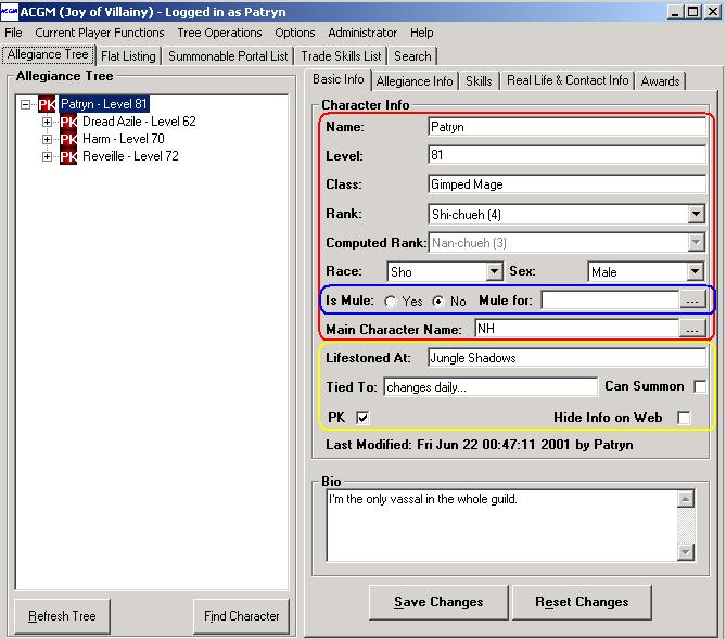 You are welcome to fill out the other sections and you can make your information not available on the website. MY SUGGESTION : Use the Decal plugin called Link. It updates your vassals, skills, patron, number of followers, etc automatically. Takes 15 seconds to type in the server name the first time and after that life is easy. I highly suggest this. Keeping this up to date is very helpful with helping us track down where in the guildtree missing people are. When you recruit someone and are adding him to ACGM, take a minute to look over your Number of Followers (total followers, not just direct) and make sure that it is still accurate.