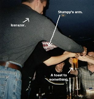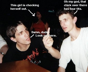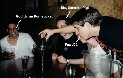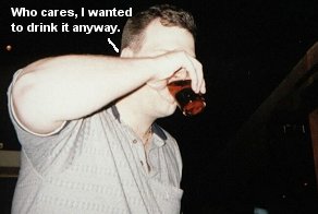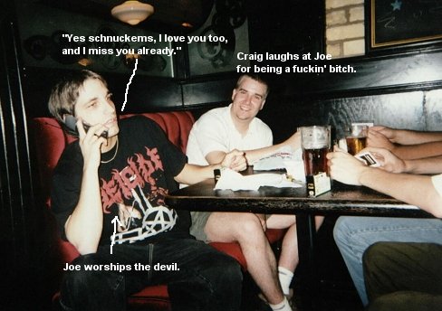 We go back inside, sit and have some more drinks/conversation, and out of nowhere, these two gnarly chicks approach us and one of them (infuriated) starts bitching at Joe and asking him why so and so did something or another. I was clueless at this point about goings on, and Joe kind of shrugs and says "no clue" to the chicks who then storm off to get one of the big Yo-Yo's with a name tag. I ask Joe what the fuck that exchange was all about, and he informs me that about 30 seconds prior, while Craig was stumbling around, that he had up and decided to toss his beer all over the gnarly chick (thus her anger) and that he had no idea why Craig did such a thing, but that it was god damned funny. I guess Craig just figured he didn't want the rest of the beer, and he thought she might want it all over her. He was just being thoughtful. It didn't seem to bother Craig in the slightest, and he sat down and began smoking a cigarette like nothing out of the ordinary had occurred.