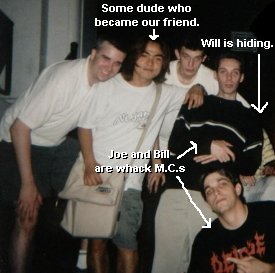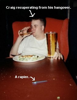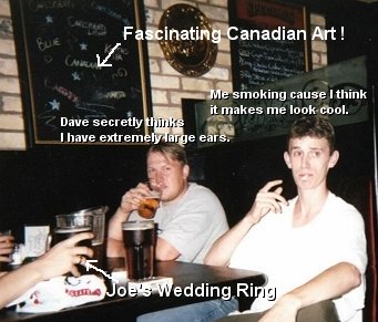 To make a long story shorter, we all went back to Bill's where a few bright morons (me and Bill) came up with the idea of playing Poker for hours. Bill got his revenge on us all by completely dominating the table with some kind of innate super poker power. I think I coughed up like 80 bucks by night's end. It was Canadian, so it wasn't real money anyway, though. At one point during the poker game, Craig was noticed making strange noises while passed out on his back, and Bill realized he was about to puke upward and all over himself, or choke to death. So in an amazing carpet rescuing attempt, he managed to haul Craig outside to the balcony where he would then send a nice stream of foreign substance speeding to the shrubbery eighteen stories below. Craig didn't rememer this part the next day, but that's a whole 'nother story.