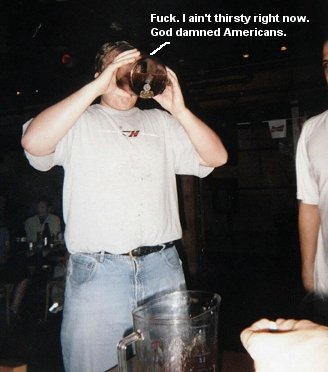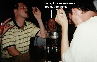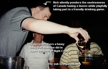After about an hour and a half of us Americans losing terribly to that gay sub game, it was time to break out with a game that seperated the Reds from the Blues. I proposed a favorite I learned at GA Tech from my brother that I was abused at in my extreme youth : Anchorman. Also known as "Quarters" I suppose in some areas of the globe. I am sure there are many variations. Anyway, the method which we played this game was as follows: 3 of us random good old American Boys would dominate the 3 Canadians - Craig, Bill, and Dave. Before the game begins, you choose an "Anchorman" for your opposing team, who is technically the one who gets to chug a pitcher of beer if the team loses. The objective is to alternate bouncing quarters into the pitcher, first team to land 3 quarters wins. The first 2 guys of the losing team drink as much as the beer from the pitcher as they can without the beer leaving their lips. The Anchorman has to take down what's left.
