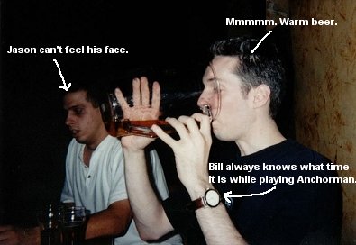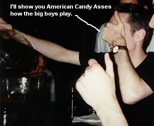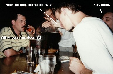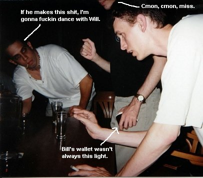 Somehow or another, and I can't recollect why, perhaps due to my owning in Anchorman, Rich, Bill, Joe started betting against each other whether I'd hit or miss a pitcher with a quarter. I was happy to oblige them on their bet, and I ensured Rich (who was betting for me) that I'd make him some easy money. After all, what'd I have to lose, wasn't my money. Plus I was fucking on that night. Bill and Joe were betting against me, so I gavem both a good scolding for doubting my mad skills, and let a quarter fly. Splash was the sound. Rich gave me a good slap on the back followed by a little praising, then persisted on betting the 2 losers again. Joe and Bill tookem up on the bet once again. I remember looking at Joe (hurt by his doubt) and teling him he was a fucking idiot for betting against me. He should know better. Ah well, he told me I was full of shit. Splash. What do you know, just made Rich another 50 or so bucks richer. I gave Joe a friendly "I told you so, fuckbucket" and he decided to sit out on the next few bets like a good bitch. This betting back and forth between Rich and Bill continued, witht he stakes getting higher and higher. About 7 times in a row I ended up getting my hand ripped off by giving Rich a good old High Five. There was a whole lot of Canadian money ending up in his pocket that night. Let's take a look at a typical Rich/Bill leading up to this point:
