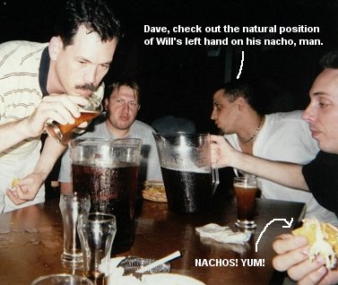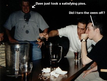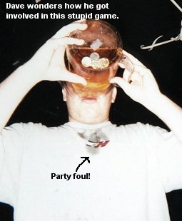 Now don't get me wrong, I enjoy beer as much as the next schmoe, but consuming beer from a pitcher full of quarters after 2 other guys have mouthed it and after it's been sitting on a table for a good while isn't high up there on the USDA recommended daily allowance list. Losing at Anchorman kind of turns out to be a punishment rather than a good time for the poor fool who has to do the anchoring. Just ask Dave, who coincidentally gets to drink again after another game against us. As you can see from the following, he tends to lose a little bit of his tasty beverage onto his shirt, making for a great fashion statement. Shit talking commences.