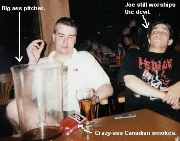 At this point, Joe and I wanted to take a breather, so we went outside to check out the long line and the asses within it, and get a breath of fresh carbon monoxide. I have no idea what was going on inside at this point in time, but I do remember Joe and I trying to get back inside and some big Yo-Yo wouldn't let us back in, which was somewhat understandable due to the extremely long line. However, after an hour of deliberation with the moron, we finally managed to get it through to him that well, we had about a 400 dollar and running tab inside, and if he really didn't want us to pay for the damned thing, then we'd be more than happy to sit our asses out here with full stomachs of free beer and nachos. After he conferred with his esteemed colleagues for awhile about this new information, he finally decided it was a good idea to let us back in. It was a smart move on his part. Either way, we picked up a new technique for getting out of a bar tab free, which we're sure to take advantage of in Canada on our next visit.