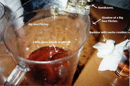 Eventually, however, Rich and I would get a bit too cocky, and some money would finally go Bill's way. Bill introduced a shot that would be quite difficult : landing a quarter in a glass inside of the pitcher. At that point though, who cared. I was on a roll, so it was worth a try. We ordered a round of Kamikaze's in preparation for what was sure to be the greatest shot of the evening.